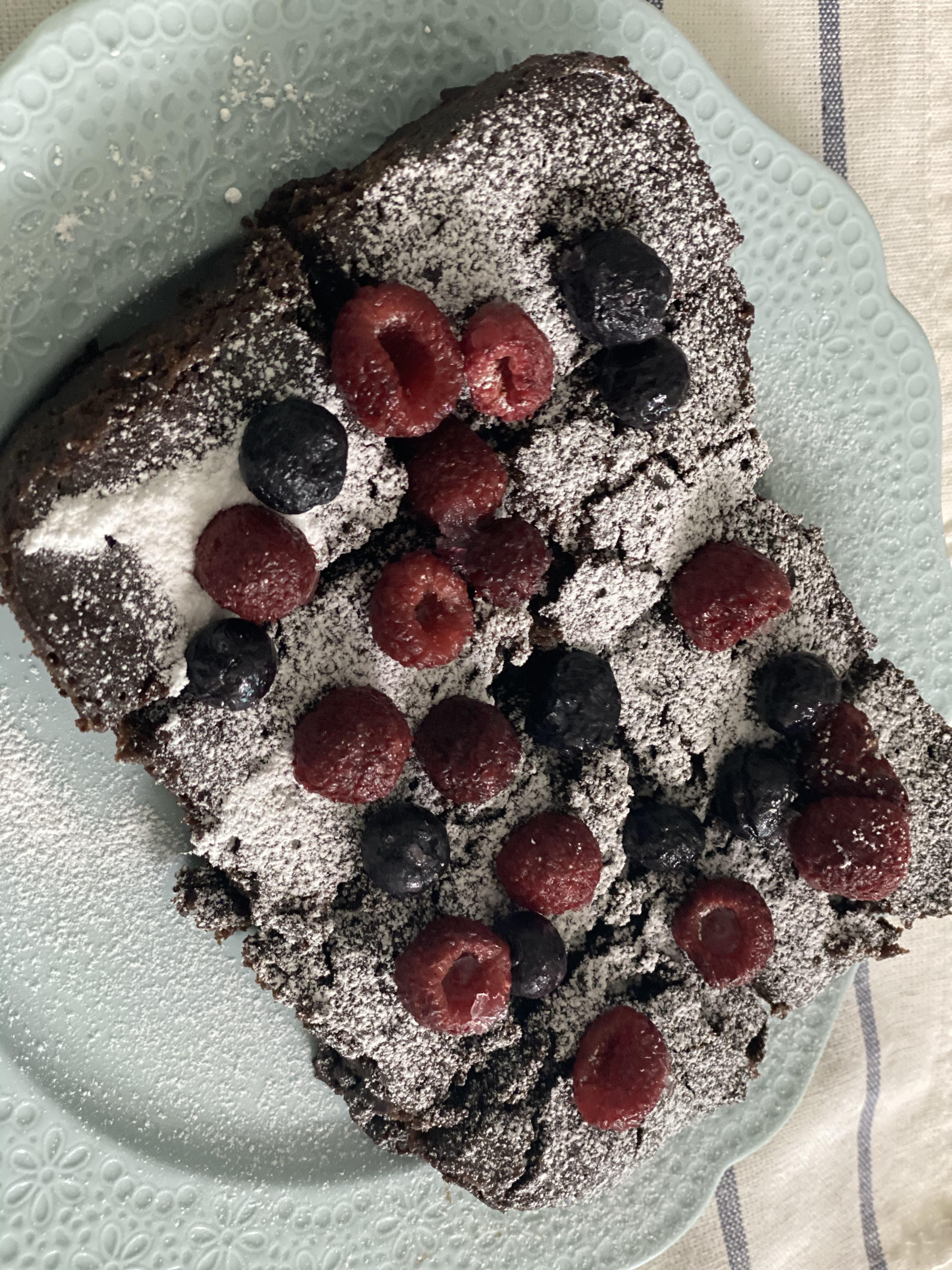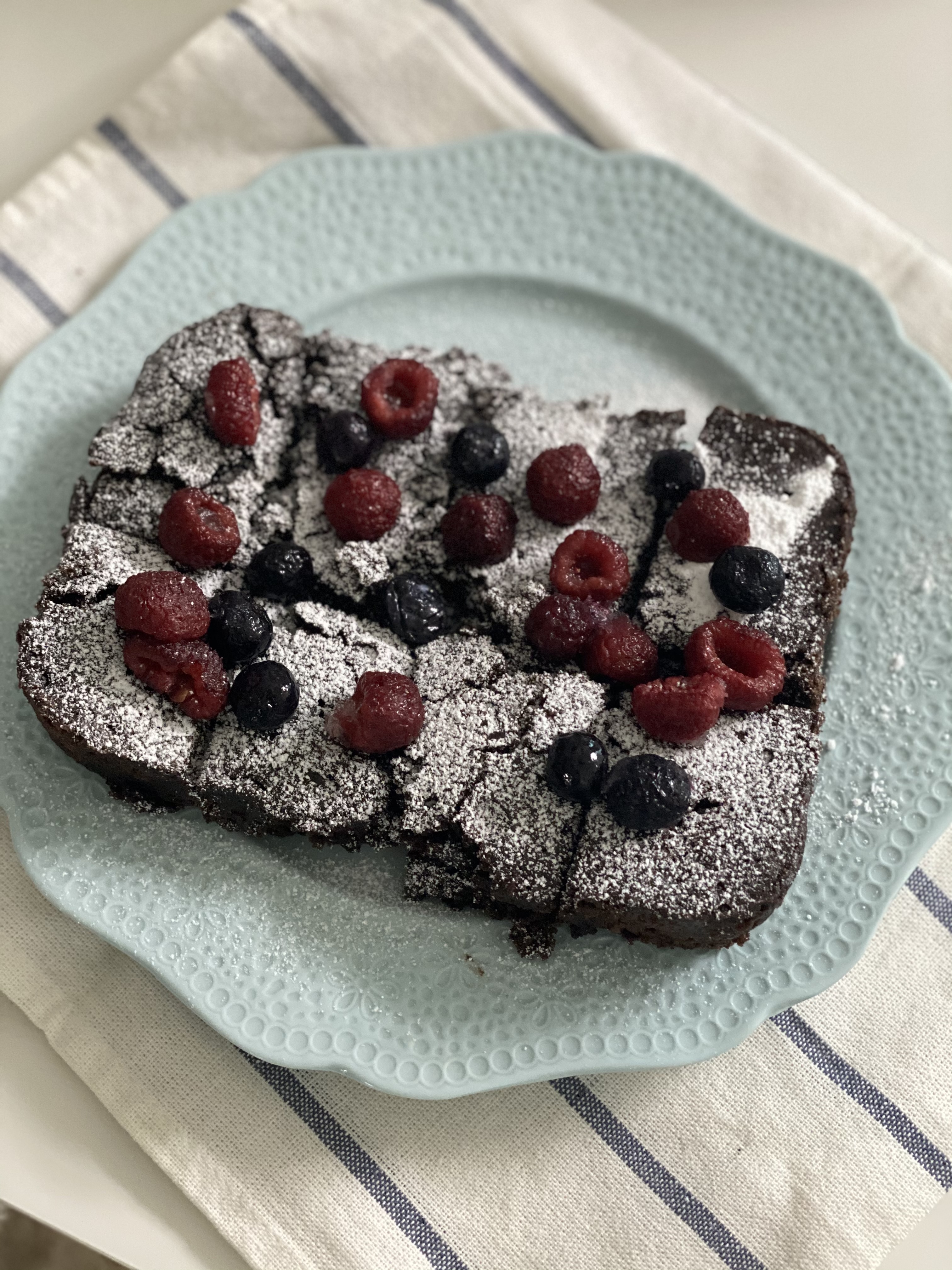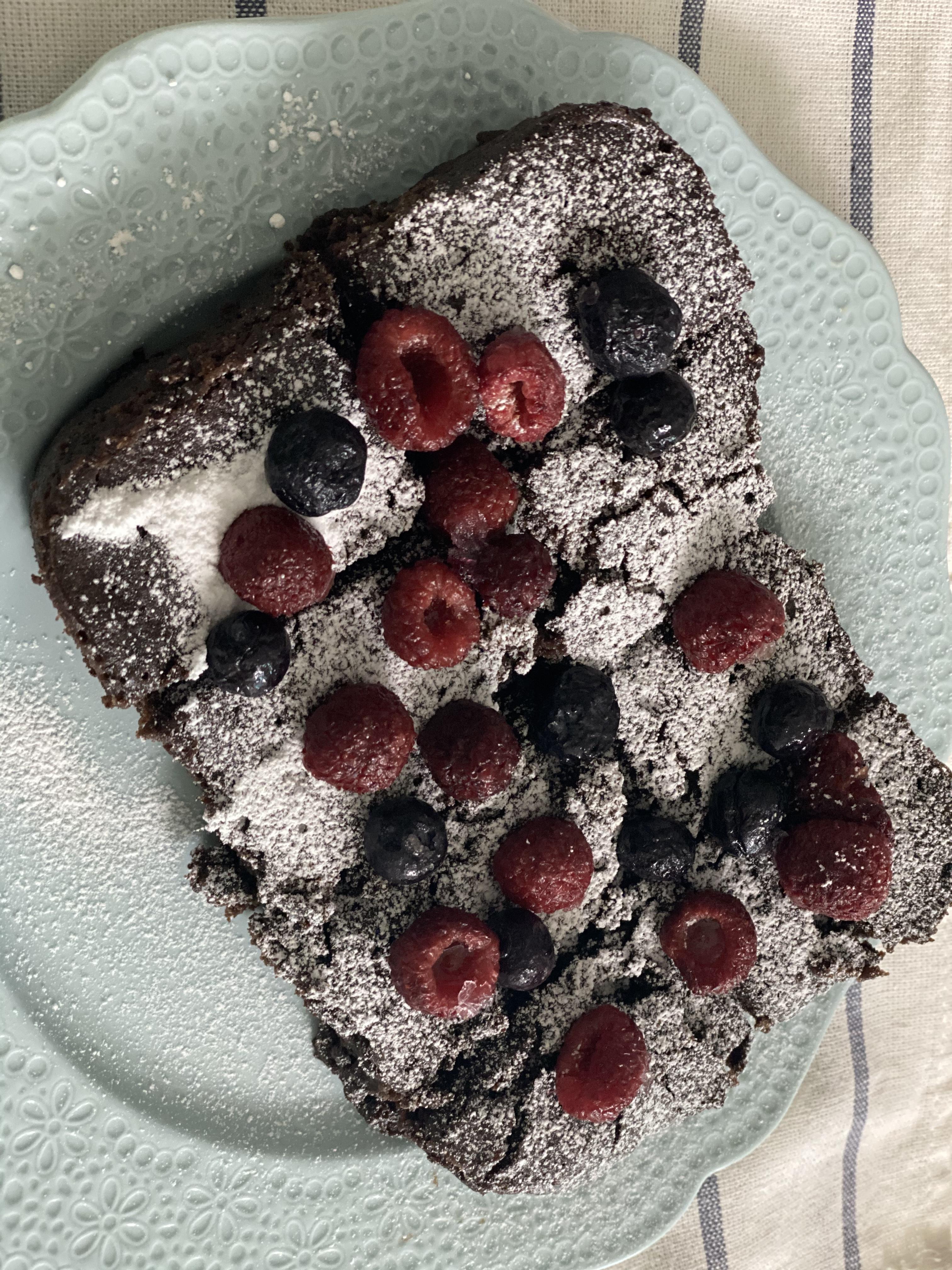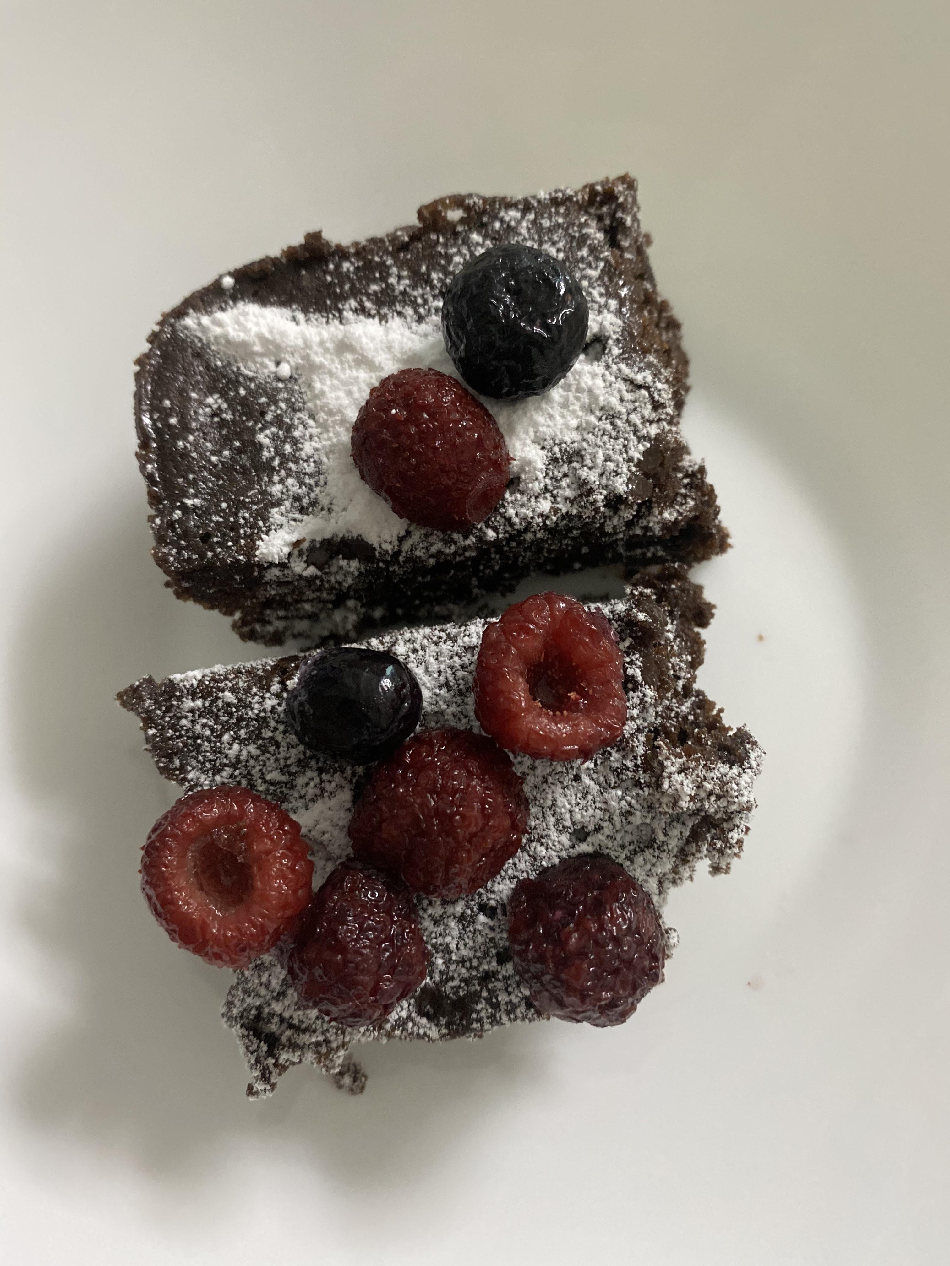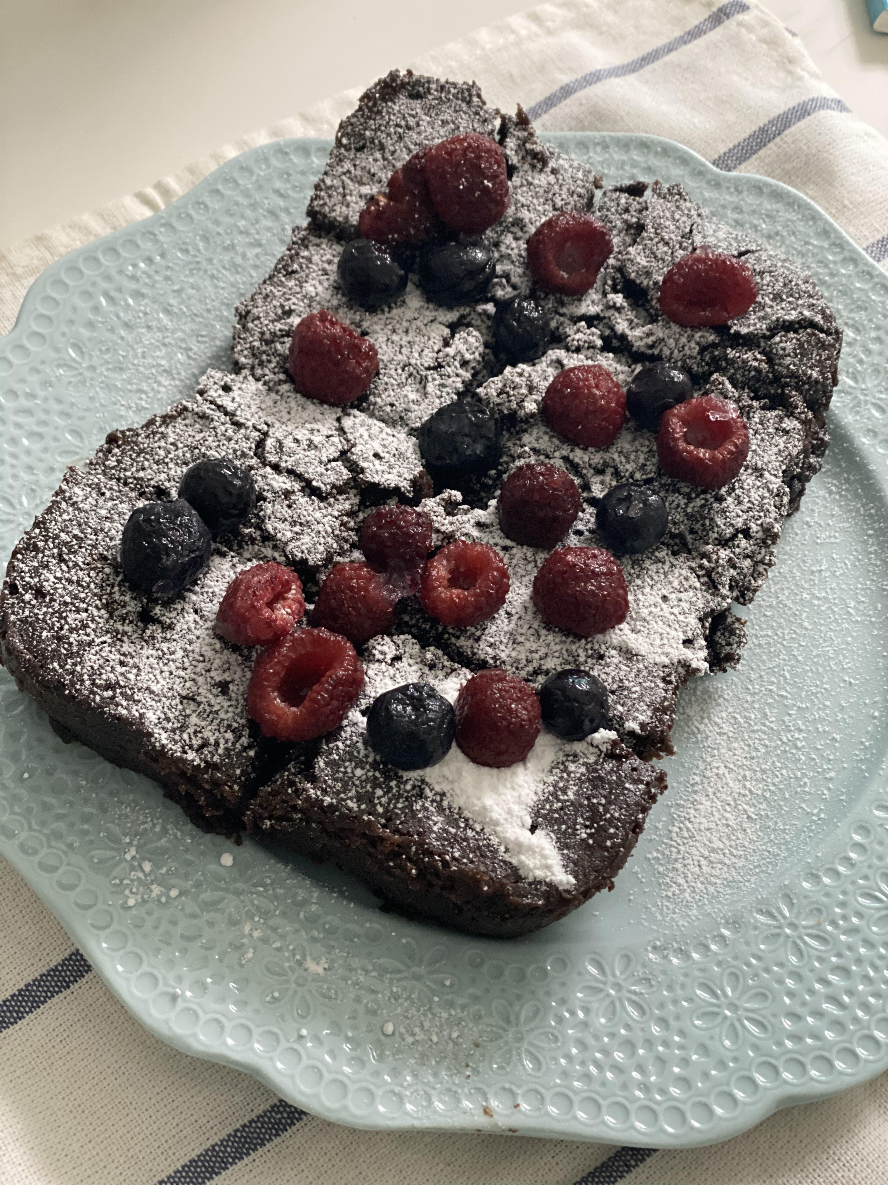 냉동실에 있던 산딸기와 블루베리를 데코해서 놓으니 제법 그럴듯한 초코브라우니가 완성되었어요.