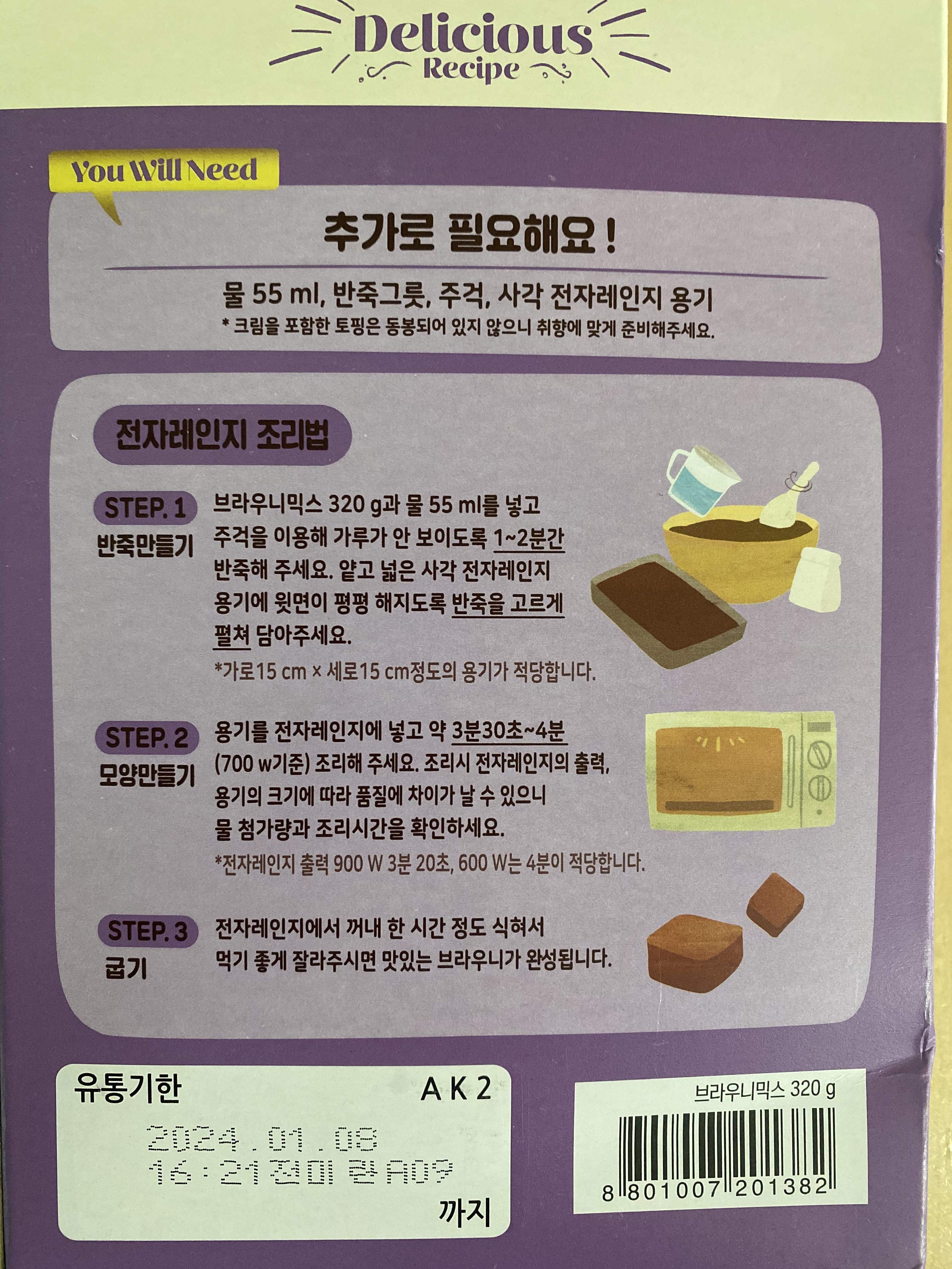 재료: 백설 브라우니 믹스, 물 55ml, 슈가파우더, 블루베리, 산딸기 보조도구: 주걱, 사각트레이, 반죽그릇, 전자렌지 |
